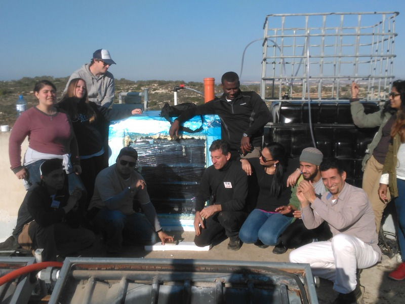 In Farkha Ecovillage in the West Bank, Mercy College Envisaj Club students worked with the local villagers on the construction of the second passive solar heated Solar CITIES 3 IBC biodigester. Farkha Ecovillage had been the site of this year’s Ecovillage Design Education workshop (EDE) in cooperation with the Tamera Global Campus and the Global Ecovillage Network (GEN).  For this project, we choose a roof space behind the solar hot water system, one building over from the kitchen.